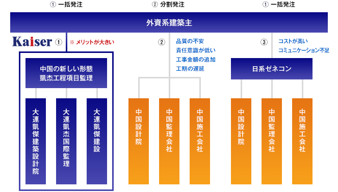 また、中國國內における日系もしくは歐米の建設會社が建設を擔當する場合は、設計?監(jiān)理?を外注委託し、施工はローカル建設會社に下請けとして発注を行っています。この場合、日系建設會社が入ることによってコストが高くなり、下請け企業(yè)間でのコミュニケーションがスムーズに行われにくい等の問題があり、対応力の低下が発生してしまいます。