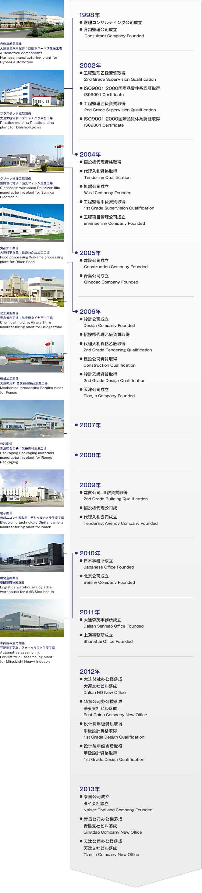カイザーは、創(chuàng)業(yè)以來(lái)、急速な成長(zhǎng)を続けてきました。企業(yè)の成長(zhǎng)とともに、建設(shè)工場(chǎng)の業(yè)種の幅も広がり、今や工場(chǎng)建設(shè)において主要な業(yè)種の多くを請(qǐng)け負(fù)うまでになっています。